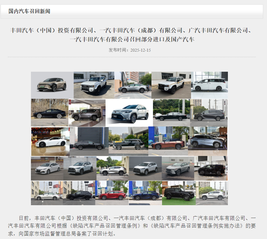 值得注意的是,这已是丰田系在2025年发起的第三次大规模召回,前两次分别发生在3月和9月,涉及车型包括卡罗拉双擎E+、雷凌双擎E+以及部分进口雷克萨斯车型,召回原因均为软件设计缺陷,分别是混动系统控制软件漏洞和自动驾驶辅助系统算法偏差。三次召回累计涉及车辆超35万辆,覆盖丰田在华新能源和燃油车主力产品线,召回规模位居2025年合资品牌首位,成为名副其实的12月“召回王”。这一系列密集的召回事件,不仅让丰田的产品质量口碑遭受重创,更暴露了这家全球最大的传统燃油车巨头在电动化、智能化转型过程中,面临的严重软件技术短板,引发了行业对传统车企转型困境的深度思考。